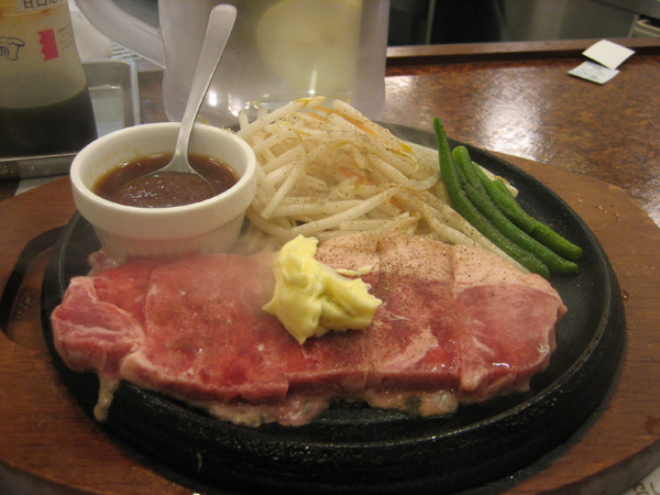 I ordered from (and paid) a vending machine, and then presented my ticket to a server. A few minutes later, the steak basically came out raw (with butter on top) on this hot cast iron plate. I stir fried it until it was cooked, and then doused it with that sauce. Served with bean sprouts, green beans, and rice. And, of course, a beer.